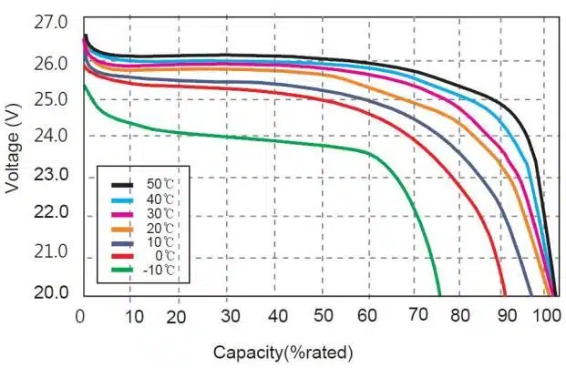 On the left is different temperature discharge curve @0.5C for 24V 150Ah lithium battery.